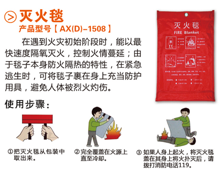 撲滅初期火災(zāi)的有效工具。發(fā)生火災(zāi),立即取出滅火毯,覆蓋火源,達(dá)到有效的隔氧滅火;此外一旦火勢(shì)蔓延,在緊急情況下,可將毯子裹在身上充當(dāng)防 護(hù)用具,避免人體被烈火燒傷。