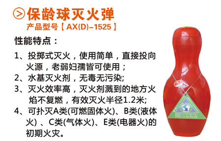 適于老年人進(jìn)行滅火的有效工具,不需要任何的技術(shù),只要借助自身的力氣將保齡球滅火器扔向著火地點(diǎn),有效滅火面積5平方米。