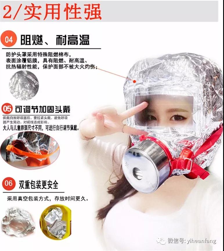 發生火災時,佩戴“海麗安心”過濾式消防自救呼吸器,可通過過濾裝置吸附、吸收、催化及直接過濾去除一氧化碳、煙霧等有害氣體,保證人員的生命安全。