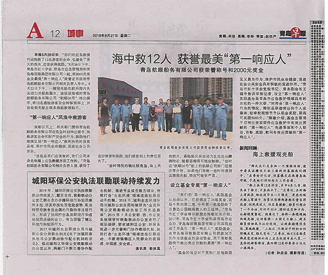 8月26日下午,青島市紅十字會,青島應(yīng)急管理局和青島海麗雅集團有限公司一起,將2000元獎金和最美 "第一響應(yīng)人"榮譽證書送到青島航順船務(wù)有限公司相關(guān)負責人手中。8月22日下午,一艘觀光船在膠州灣內(nèi)失去動力并船艙漏水,途徑該海域的青島航順船務(wù)有限有限公司,"航順26號"伸出援手,將12名遇險游客安全轉(zhuǎn)移到岸上,并協(xié)助觀光船主聯(lián)系拖船救援船只。