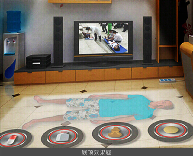 家居消防安全設(shè)備展示方式:通過地面投射的方式,展示一個(gè)不同程度燒傷的傷員,參觀者通過選擇不同的處理辦法,進(jìn)行傷員的虛擬救助。