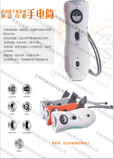 產品名稱:安心品牌多功能手搖自發電手電筒 型號:AX(D)-1808 規格:安心 統一零售價:168元 產品簡介: 1、應急照明,手搖自發電,手搖一分鐘可照明約30分鐘; 2、收音機功能,可以在緊急情況下及時獲取外界信息,緩解人的恐懼感; 3、具有報警功能,緊急情況下可以代替人大聲呼救,以節省體力; 4、配有USB電源線,可以對手機進行充電,手搖一分鐘可應急通話3-5分鐘; 5、熒光防滑邊設計,便于在黑暗環境下找到; 6、非常適合居家、戶外等使用。